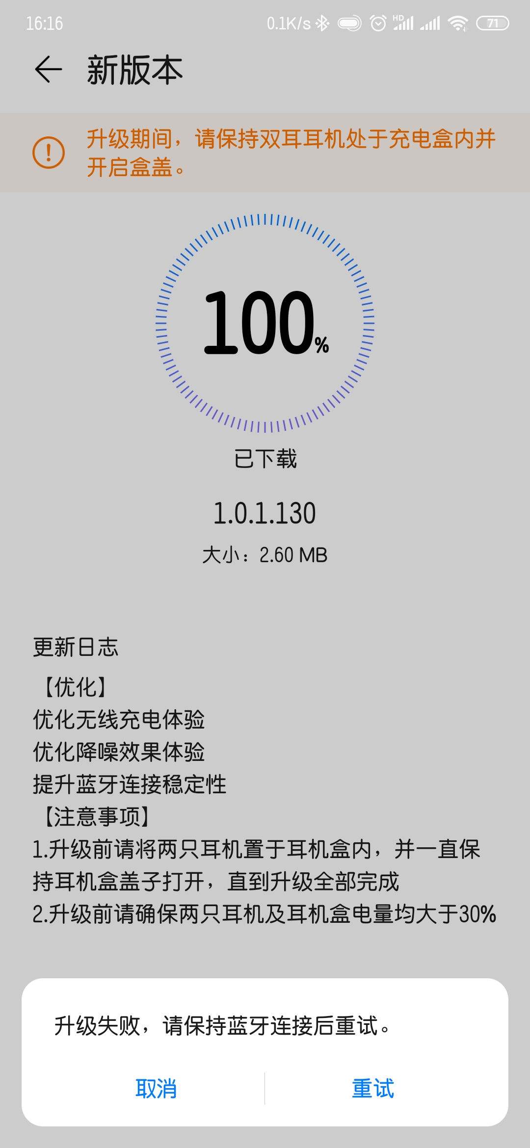 前不久9月底刚买了华为的freebudspro,在手机版本0716下,升级了当时耳机版本122。10月6号左右在耳机后续推出130版本后,同样的手机版本下却无法升级耳机版本,一直显示耳机升级失败,请保持蓝牙连接后重试。表现状况为升级时蓝牙突然断了又再连,始终无法升级。起初以为是耳机问题,联系了华为客服接通了许多电话,按他们的操作后依然没有效果。后来在我用以前的一部老手机尝试时,成功升级。有无大神知道这是什么情况?是黑鲨的蓝牙问题吗?