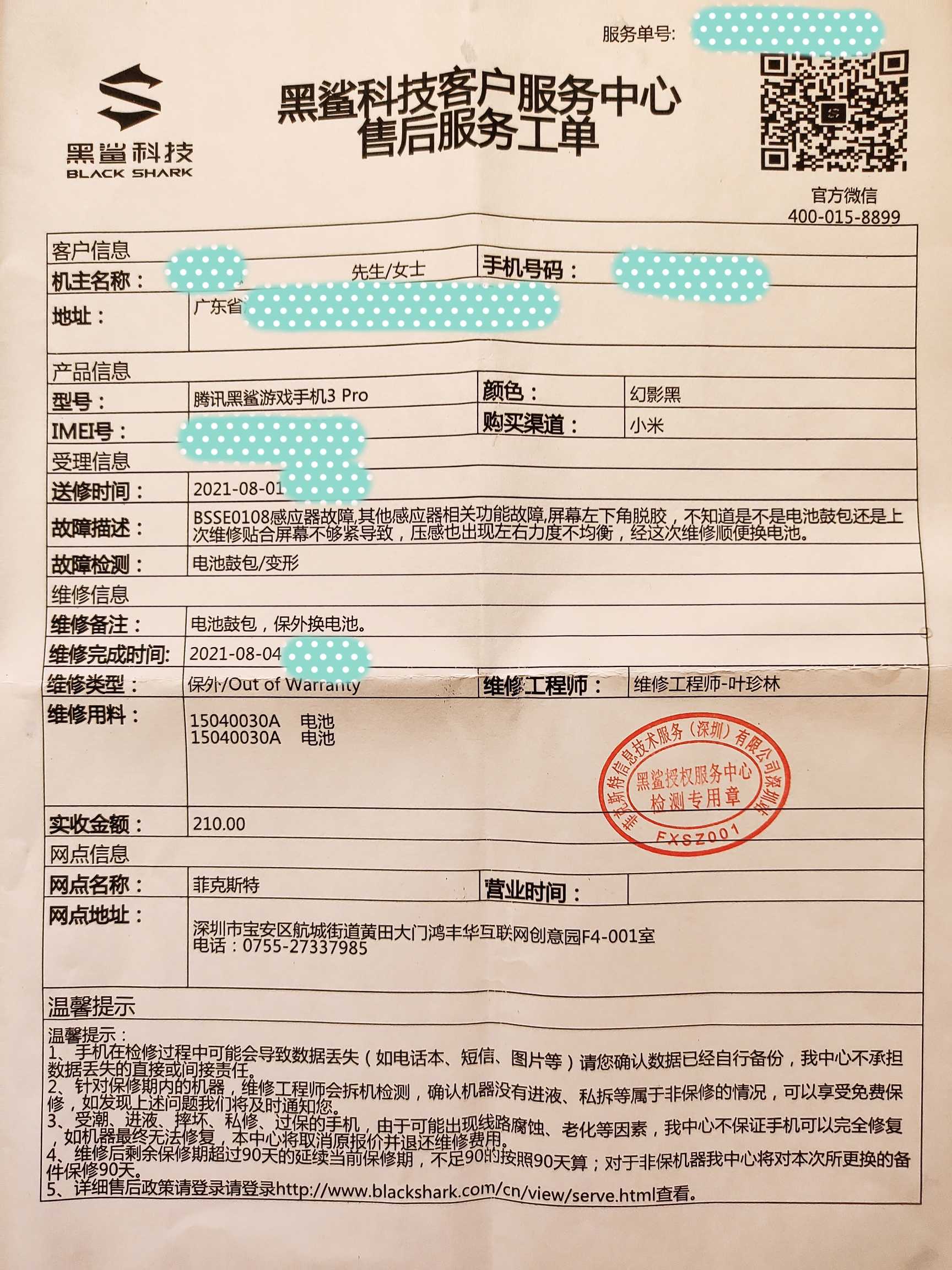 BS_40844600 发表于 2021-8-11 23:45 本人昨年8月8日在小米商城下单购买黑鲨3Pro手机,今年7月29日因电池发热引起屏幕大面积翘边,部分黑屏,屏 ...