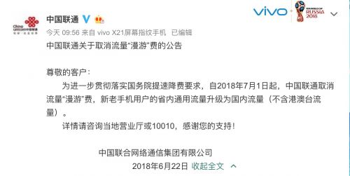 6月22日消息,中国移动、中国联通、中国电信三大运营商今日相继宣布,自2018年7月1日起,取消流量“漫游”费,新老用户省内流量升级为国内流量(不含港澳台)。今年的政府工作报告中指出,要明显降低家庭宽带、企业 ...