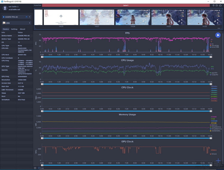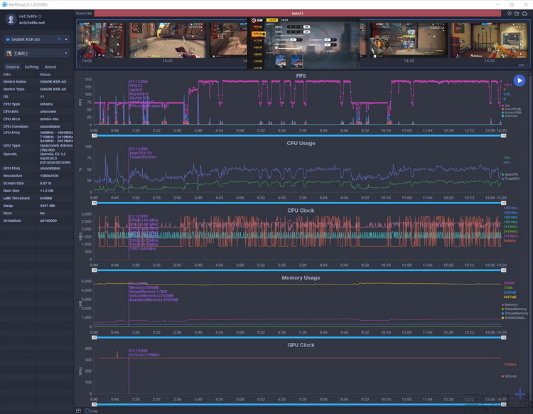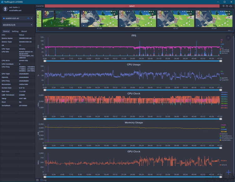 我们依旧选择了《原神》作为测试项目,毕竟这是目前公认,对手机性能压力最大一款游戏。仔细分析测试数据不难发现,黑鲨4可以说是已经将骁龙870的性能发挥到了极限,甚至在整个游戏的过程中,骁龙870 3.2GHz的超大核都完全没有降频(显然这很难得)。但毕竟骁龙870的性能与骁龙888还是有着一定的差距,所以大家会发现,黑鲨4的确能够将《原神》最高画质设定下的帧率跑到60帧,但并不能像黑鲨4 Pro那样几乎稳成一条直线。而这,就是旗舰与次旗舰之间的体验差异所在了。