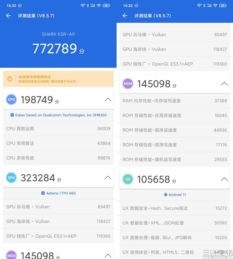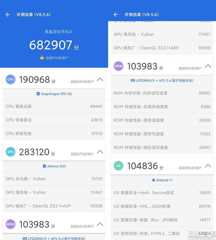 在使用安兔兔评测对黑鲨4与黑鲨4 Pro分别进行了测试后可以看到,无论是黑鲨4还是黑鲨4 Pro,都达到了可能是各自所基于平台的有史以来最高纪录,其中特别是黑鲨4 Pro的存储方面得分更是高得惊人。事实上,在我们安装各类软件与游戏的时候,也已经注意到了它每次几乎都是瞬间就完成了安装过程,从这一点来说,黑鲨4 Pro超强的性能并不只有在游戏的时候才能体现出来,而且也确实是实至名归。