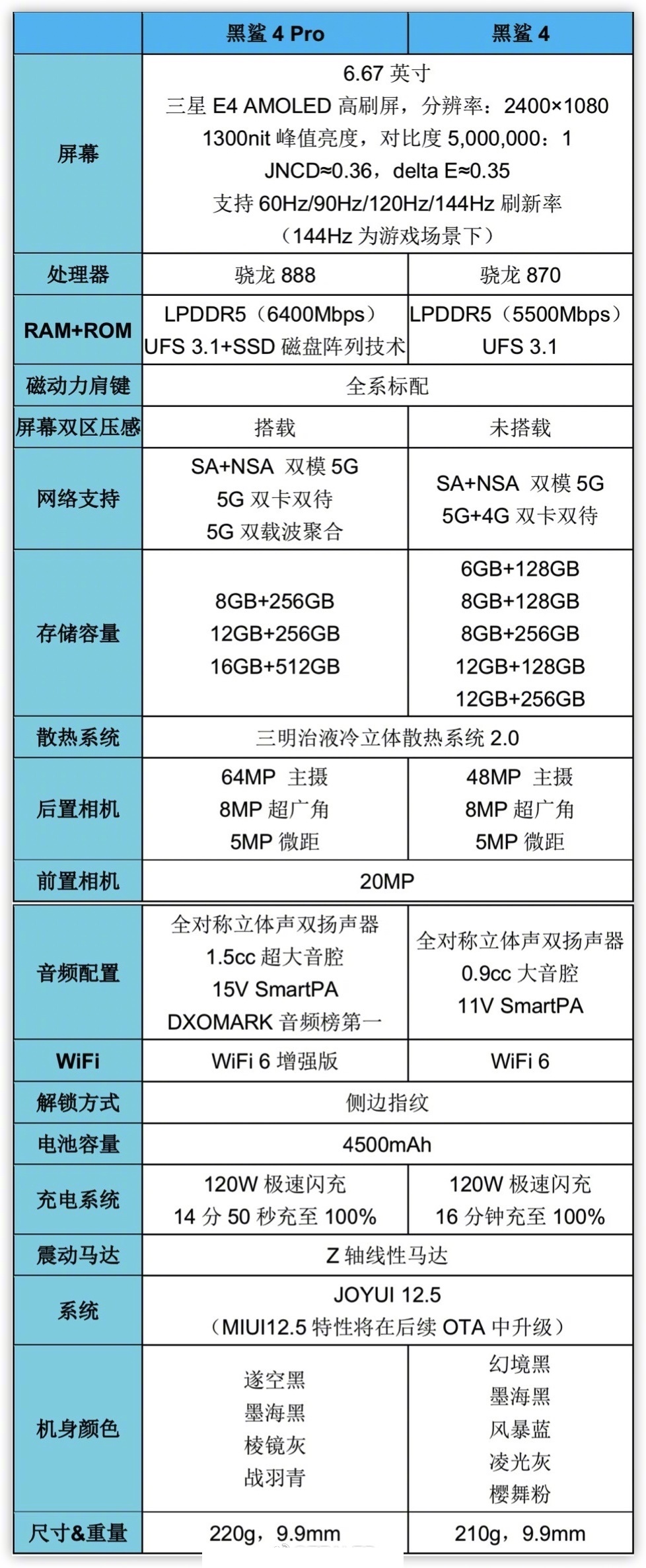附:黑鲨 4 和黑鲨 4Pro 配置表