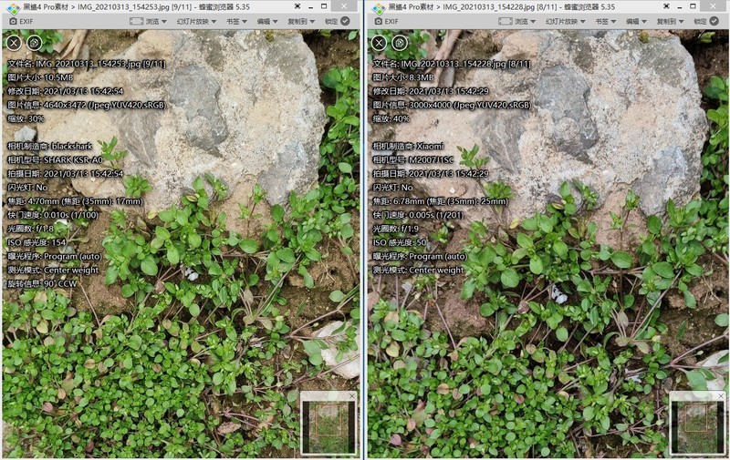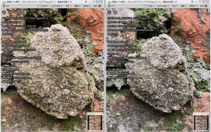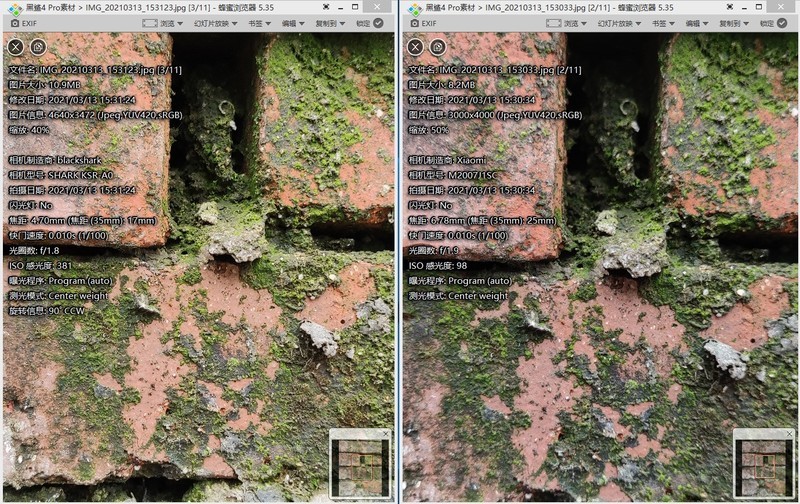 游戏手机虽然相机不是重点,但黑鲨4 Pro仍然采用了旗舰级的6400万主摄,样张对比的是小米10至尊版,这张黑鲨4 Pro细节较为清晰,但颜色不如小米10至尊版丰富,青苔的绿色更绿。