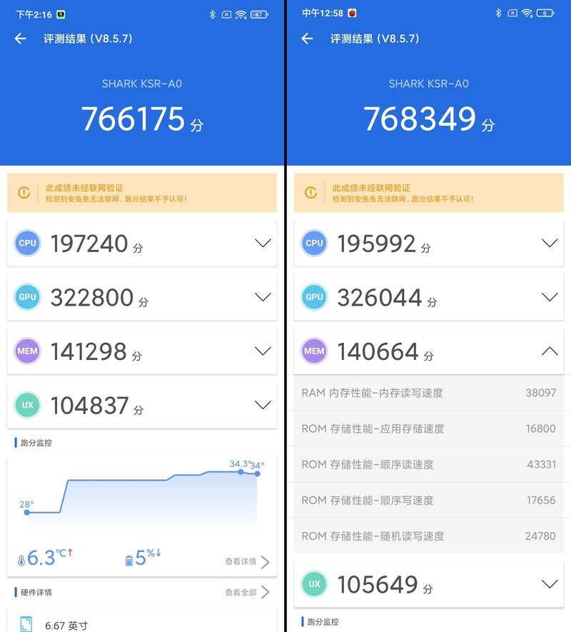 由于UFS+SSD磁盘阵列技术的加持,黑鲨4 Pro的性能相比其他骁龙888手机明显高一些,安兔兔跑分达到了76.8万分,其中MEM子项的分数明显比其他骁龙888手机高,这都是ROM存储性能立功了。