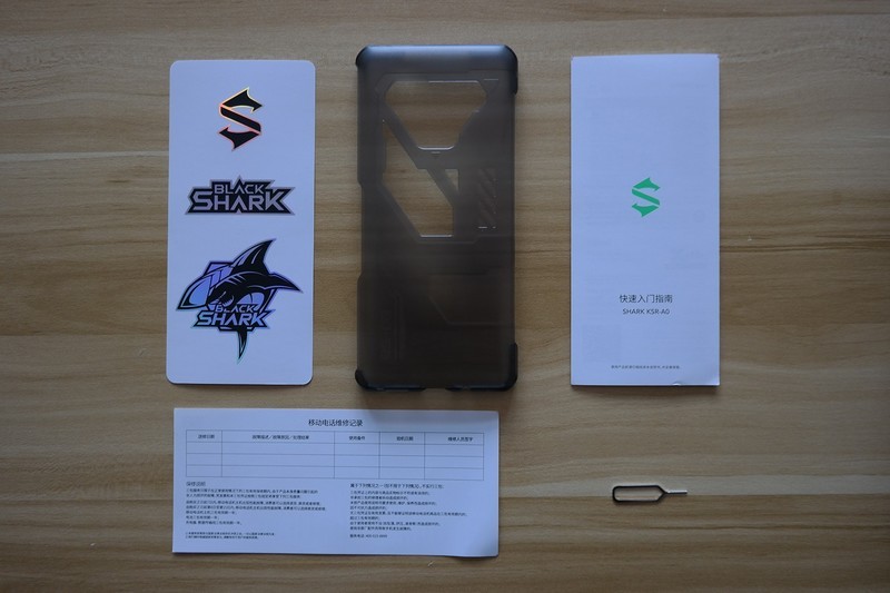 附件盒里还是熟悉的几样配件,包括附送的黑化半透明保护硬壳、黑鲨贴纸、说明书、保修卡和SIM卡针。