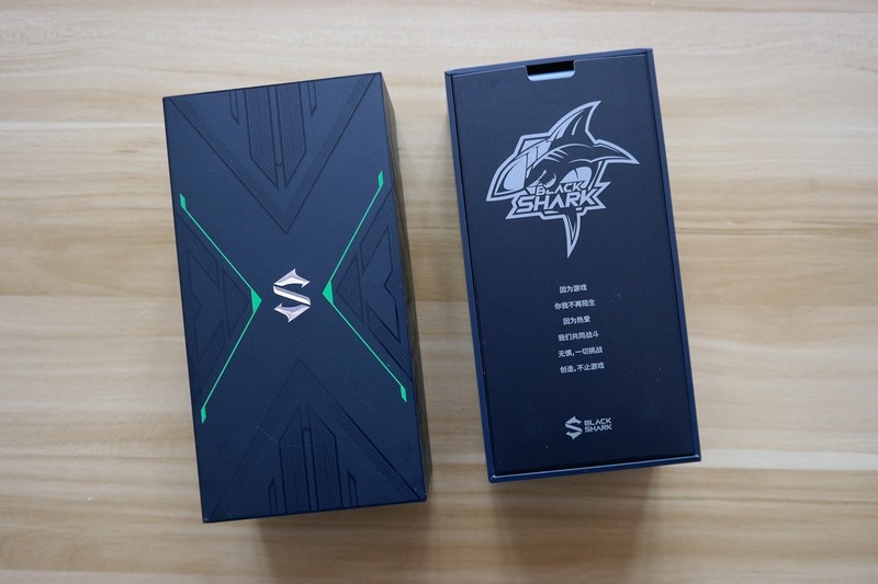 包装盒与以往一样,而内部的包装也是如此,拿掉顶盖后首先看到的是附件盒,附件盒上写有黑鲨为游戏而生的口号。
