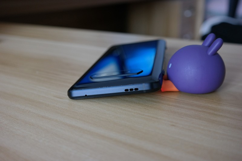 由于采用了挖孔全面屏设计,所以黑鲨4 Pro的扬声器不再是正面了,而是与其他主流旗舰机一样放在了上下边框上,所以顶部除了降噪麦克风,还有三个椭圆形的扬声器开孔。