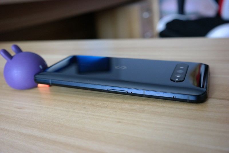 侧面是音量键和SIM卡槽,边框上有明显的天线条开孔,所以黑鲨4 Pro的边框材质自然是金属。而金属边框的好处不仅仅是坚硬,其还能辅助散热,黑鲨4 Pro采用了新一代的三明治散热系统,游戏时的温度表现很不错。
