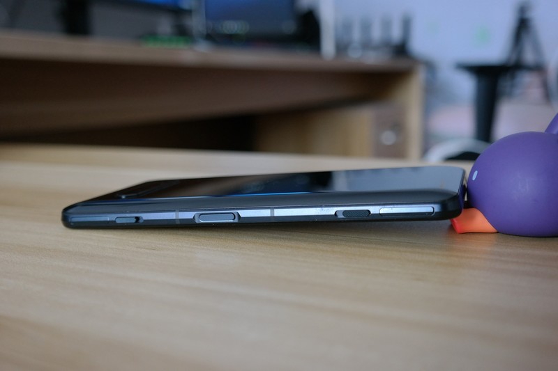 左侧上下是两个升级肩键及滑动开关,中间是电源指纹二合一按键。