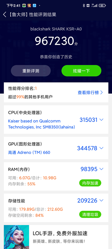 黑鲨4 Pro在跑分测试的环节中也是非常强悍。安兔兔跑分成绩为832899,鲁**跑分成绩为967230,两个得分都达到了行业顶级水平。当然,跑分毕竟只是一个性能的标准,手机的体验好不好还需要看处理器、内存和存储以外的配置。