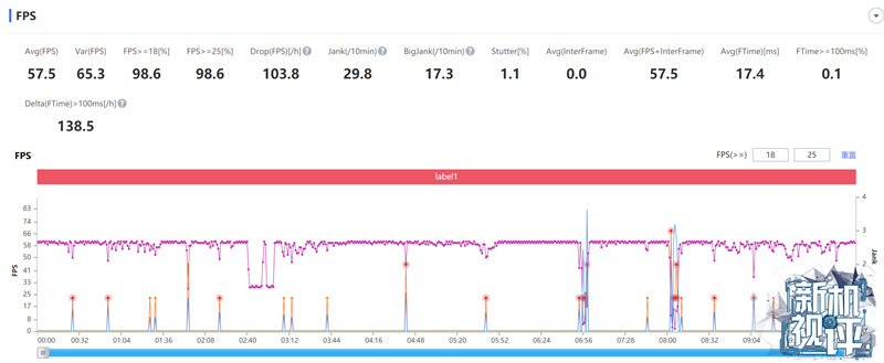 在10多分钟的战斗操作中Perfdog的FPS维持在了57.5Hz,得益于保护壳与背夹强大的冷却能力,手持时明显感受到机身温度没有出现过热。值得一提的是,与出厂附送的保护壳不一样的是,该散热保护壳中间增加高导热率的陶瓷+金属散热传导片,除了外观更炫酷,散热效果更佳。