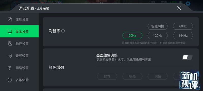 在实测中我将图像质量设置到了极致画质,从Perfdog的数据采集结果显示,游戏中FPS平均值在89.7,英雄走位与释放连招都更为顺手。特别是这次采用了E4发光材料的三星AMOLED的屏幕显示战斗画面更加逼真,人物色彩更饱满。